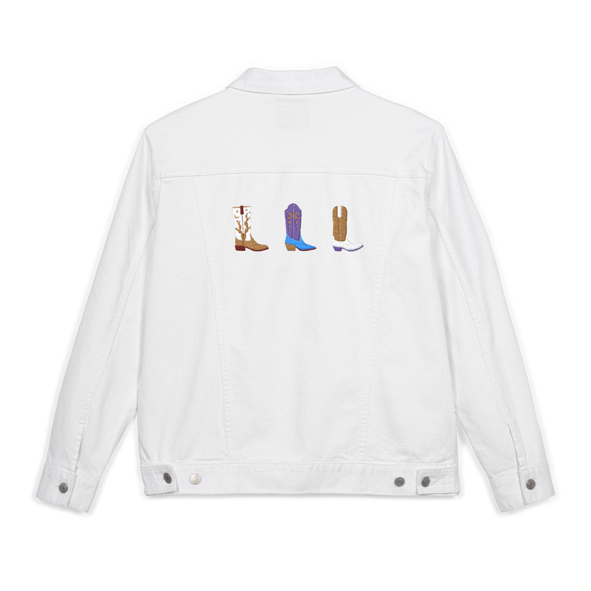 Cowgirl Boots. This stylish Unisex Denim Jacket is perfect for adding a touch of flair to any outfit. Crafted from a soft, high-quality fabric blend, this jacket features beautiful embroidery and an eye-catching design that elevates your wardrobe. Ideal for casual outings or a night out with friends, it offers both comfort and style. Whether you're heading to a concert, a summer festival, or just enjoying a laid-back day, this jacket will keep you looking effortlessly chic.