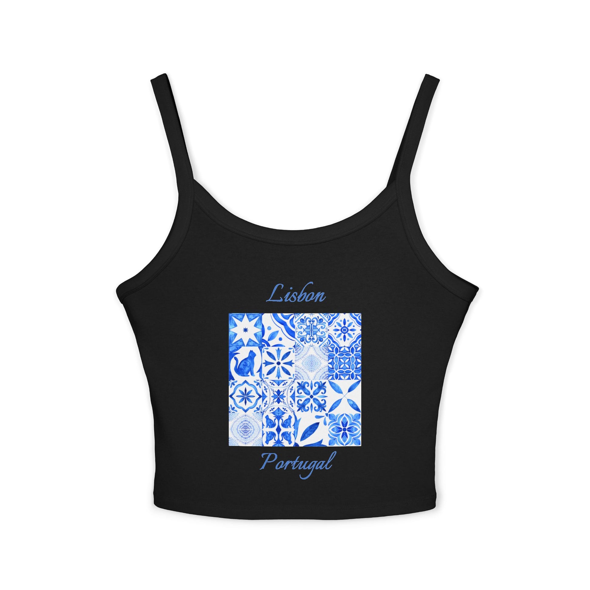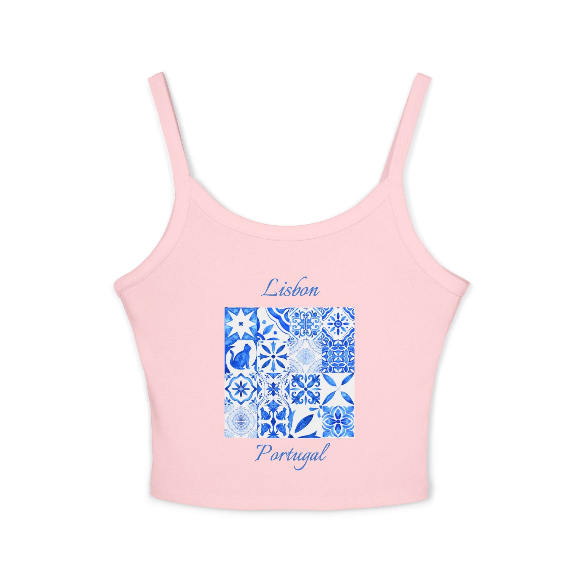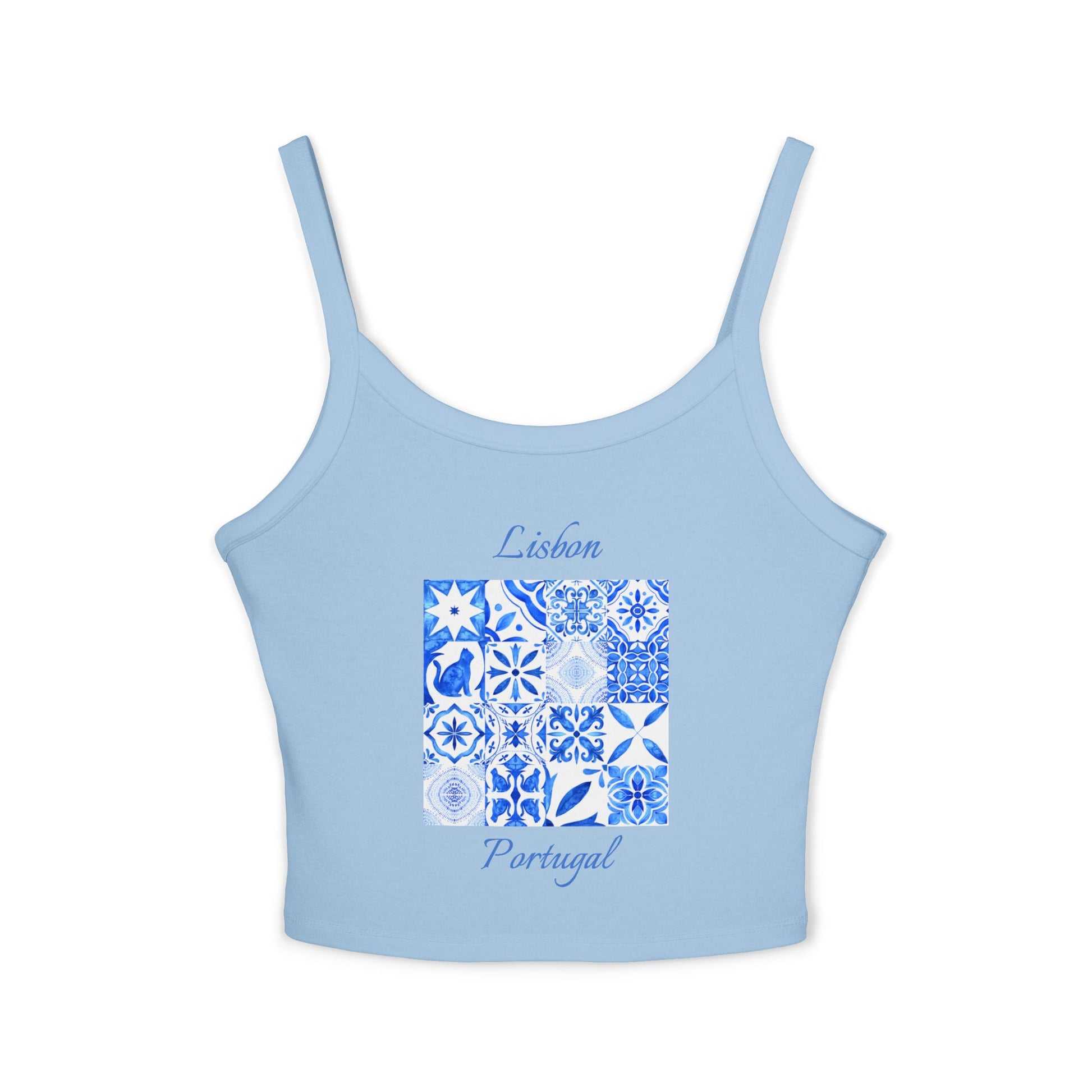 Lisbon. Our stylish spaghetti strap tank top is perfect for those warm sunny days. This tank brings a touch of elegance to your casual wardrobe with its soft fabric and flattering mid-length cut. Feel the summer vibes as you layer it with your favorite shorts. The tank top is perfect for summer vacations and casual outings.