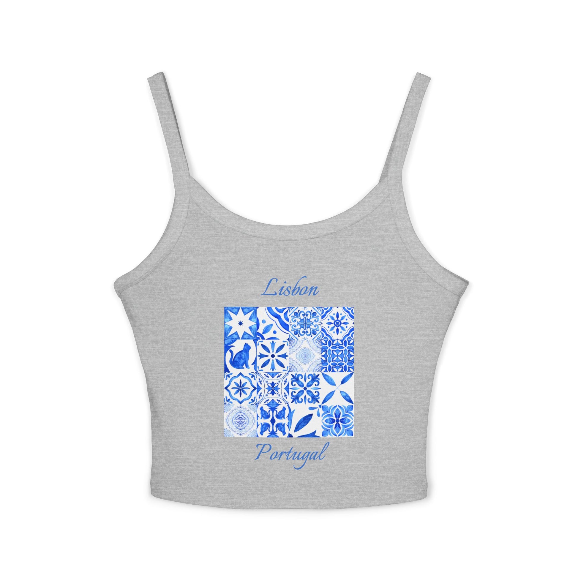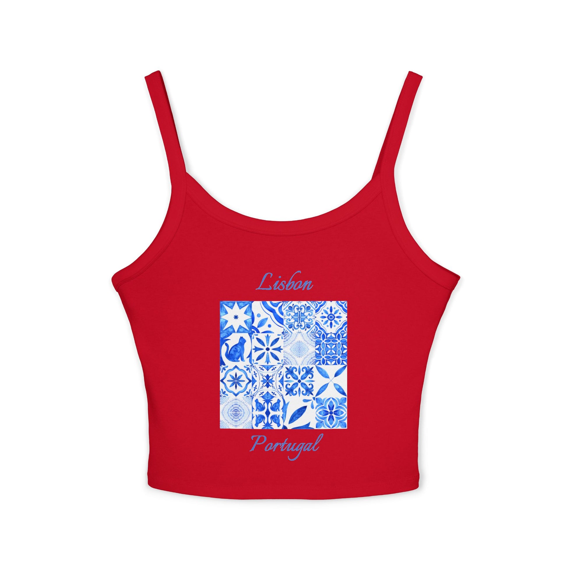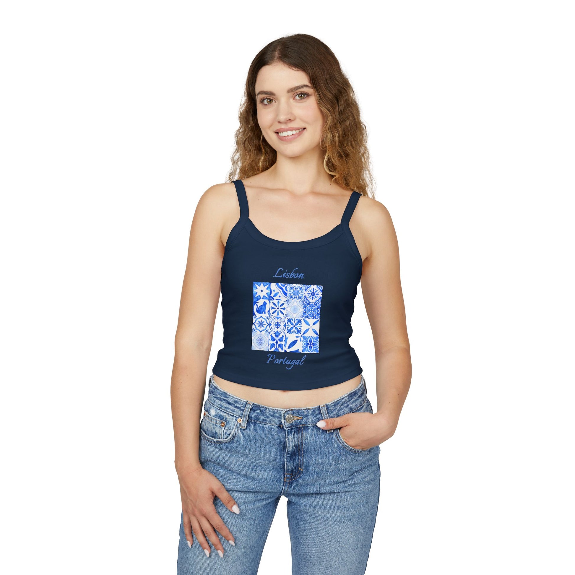 Lisbon. Our stylish spaghetti strap tank top is perfect for those warm sunny days. This tank brings a touch of elegance to your casual wardrobe with its soft fabric and flattering mid-length cut. Feel the summer vibes as you layer it with your favorite shorts. The tank top is perfect for summer vacations and casual outings.