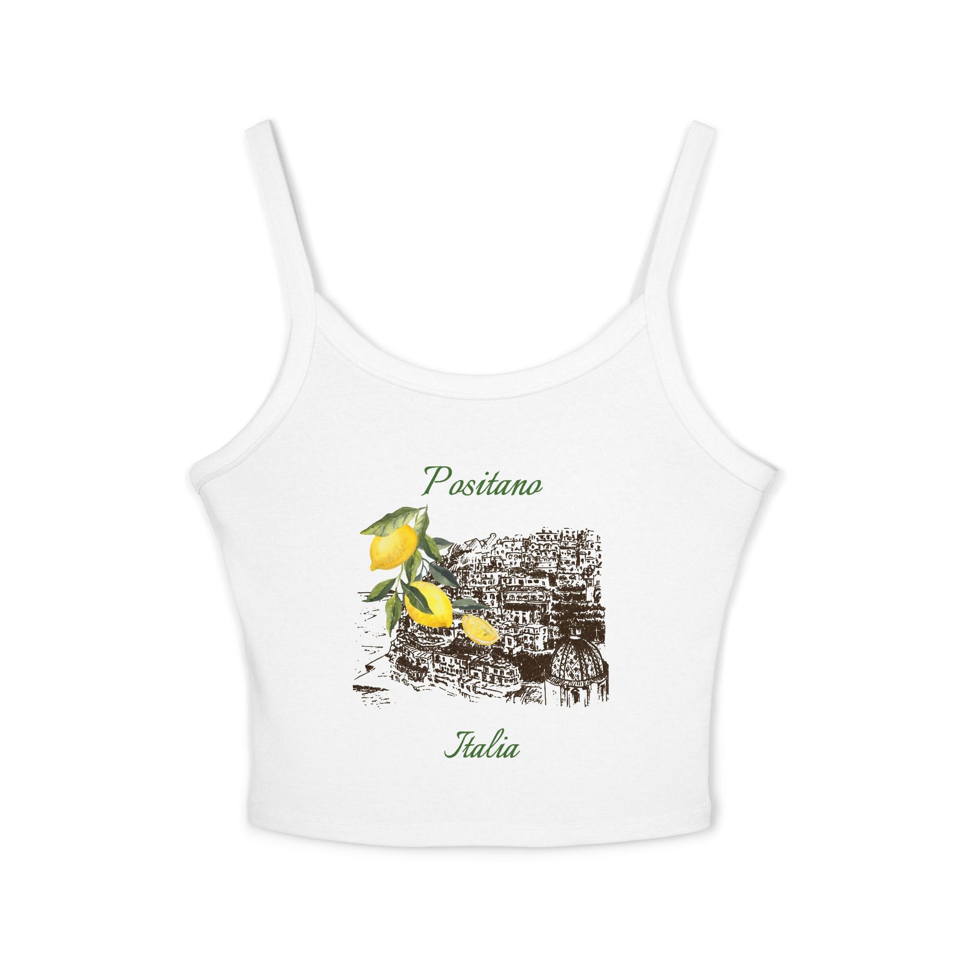 Positano. Our stylish spaghetti strap tank top is perfect for those warm sunny days. This tank brings a touch of elegance to your casual wardrobe with its soft fabric and flattering mid-length cut. Feel the summer vibes as you layer it with your favorite shorts. The tank top is perfect for summer vacations and casual outings.